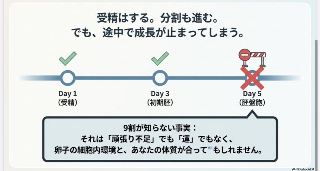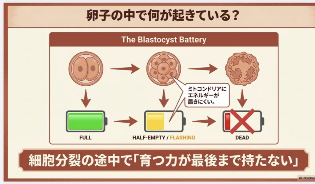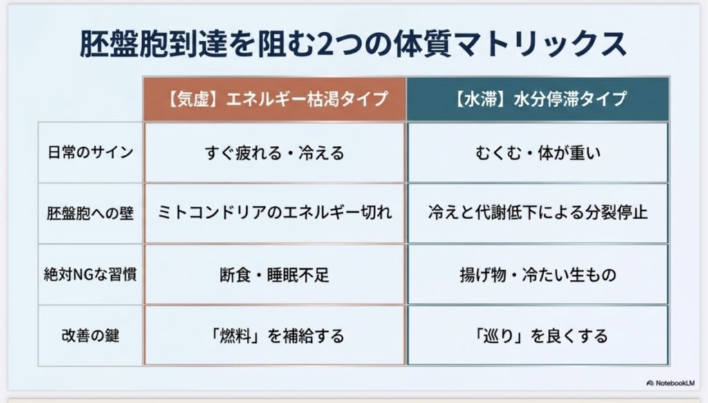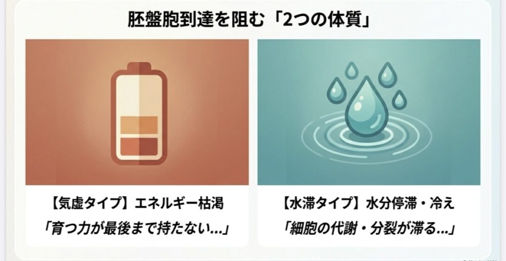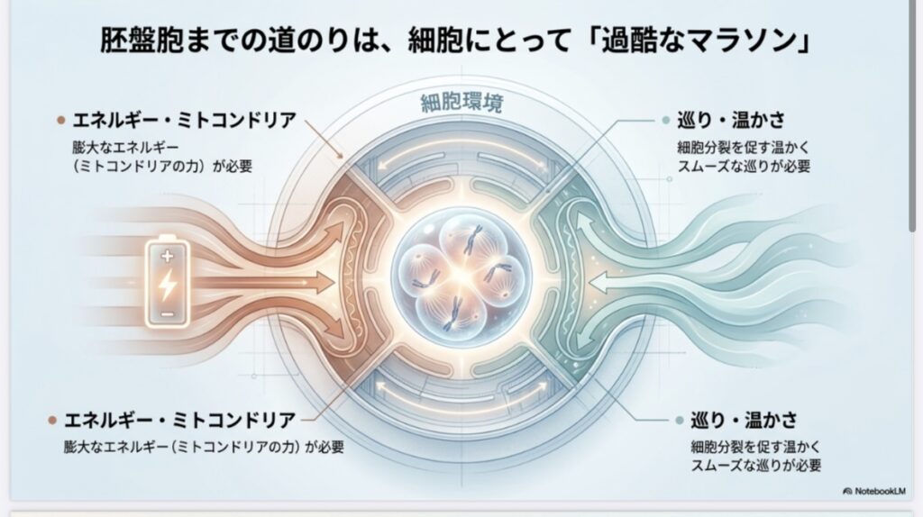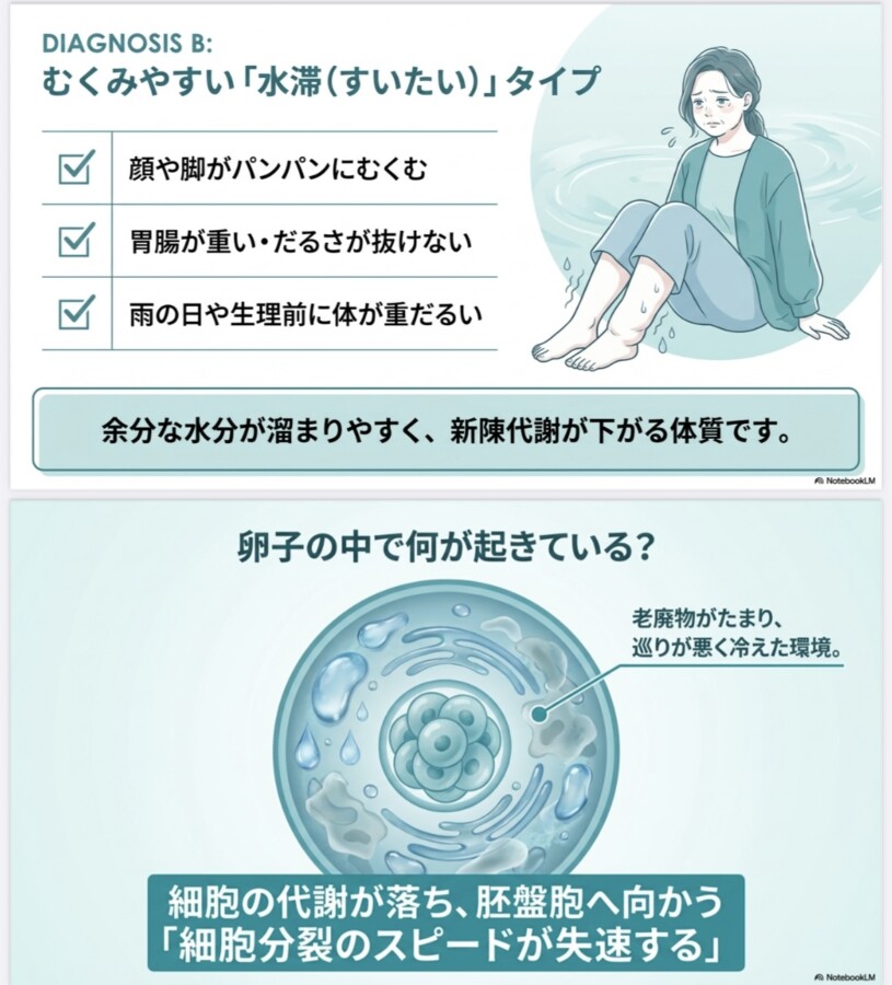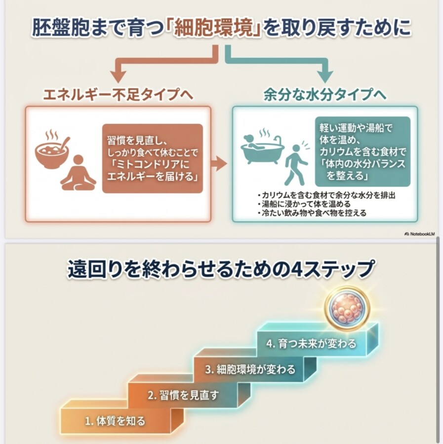 このタイプは、ミトコンドリアにエネルギーが届きにくく、受精卵などが「育つ力」が最後まで持たない傾向があります。まずはしっかり休養し、エネルギー源を枯渇させない生活が大切です。
