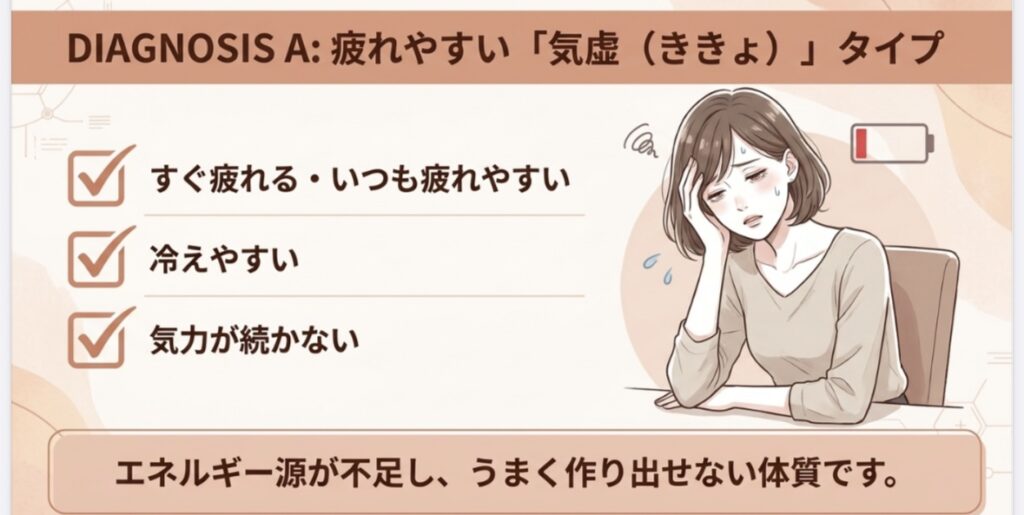 いつも疲れやすく、冷えを感じやすい方は、エネルギーをうまく作れない「気虚(ききょ)タイプ」かもしれません。