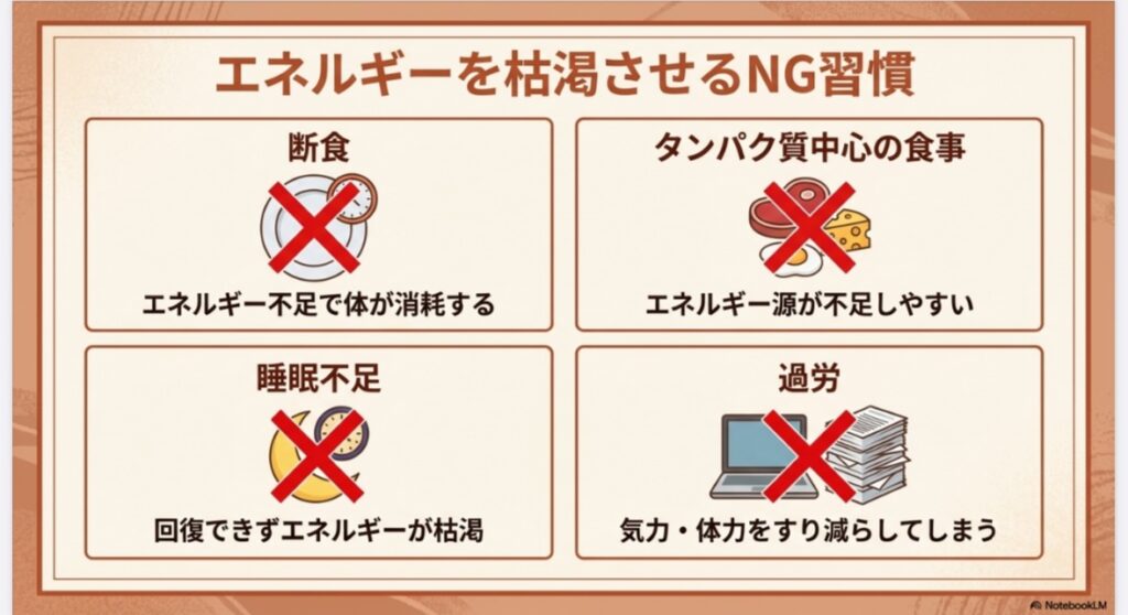 注意すべき習慣(NG行動):無理な断食、タンパク質ばかりに偏った食事、睡眠不足、過労。