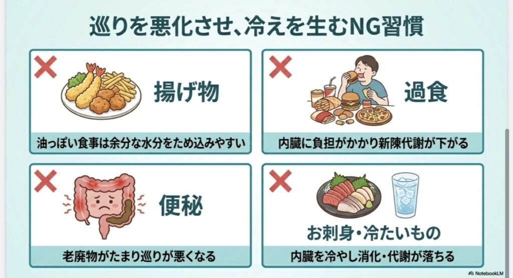 注意すべき習慣(NG行動):揚げ物(油っぽい食事)、食べ過ぎ、便秘、お刺身などの生もの(内臓を冷やし代謝を下げるため)。